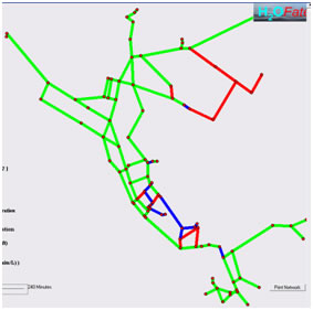 Hazard contours for a 3-hour release of a contaminant into a drinking water distribution network at a given node. Green, blue and red indicate low, medium and high