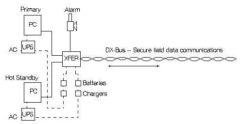 Failure of the Primary computer is determined by a cessation of the on-going DX-Bus communications (19.2KB to 115.2KB) to the field I/O system for a duration exceeding a preset value, usually 10 seconds. This loss of communications (indicative of the primary computer failure) is determined by a solid-state watchdog circuit contained in the DX-Com communication driver module. On a computer failure detection, the watchdog monitor closes a relay, which sounds a local alarm, while automatically transferring the system DX-Bus communications to the Secondary (Standby) computer. The failed Primary computer is thus disconnected, and the Standby computer continues all of the monitoring and control functions, transparent to the switchover. It is important to note that the failure determination is done independently from either computer, so a failure of either computer alone does not jeopardize the monitoring/control process. If the Primary computer fails, an alarm sounds and the transfer to the hot standby is automatic. If the Secondary computer fails, an alarm sounds and the Primary continues all of the monitoring/control functions. It would take independent, simultaneous failures of both Primary and Standby computers before the monitoring/control system would shut down, a highly improbable scenario. Since the RFile programs run independent of each Millennia-DX program -- thus providing isolation of the Primary and Secondary computer`s monitoring/control functions. Further assuring complete independence, if either computer fails, the other automatically disconnects itself from the other.