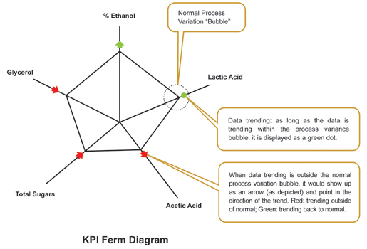 In a single page, the KPI Module graphically displays all key operations indicators for your ethanol plant. This representation shows current indicator value vs. your plant`s normal operating range and its current trend direction. Position indicators outside the normal range highlight the variance by turning red and blinking. Clicking on the indicator triggers a drill down feature which provides greater detail displayed in the most relevant format.