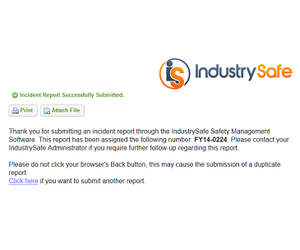 Once an incident is complete via the public form, stakeholders view a confirmation email; can upload attachments; and print a paper copy of their incident report. All data is automatically transferred to the IndustrySafe Software for more detailed follow up, analysis, and analytics by key team members including environmental, health, and safety professionals.