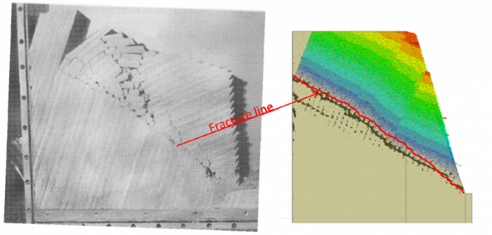 The left-hand photograph is from Adhikary et al (1997), corresponding to his centrifuge Test 7, showing post-failure deformation of a toppling assembly of layers oriented with initial dips of 69o, and a slope angle of 70o. The right-hand plot is from a lattice simulation of a similar system, after failure (but limited to small strain deformation). The black dots denote broken bonds, and the colored vectors denote displacements (where red is large displacement and blue is small displacement). The red fracture line, derived from the centrifuge result, is superimposed upon the numerical result.