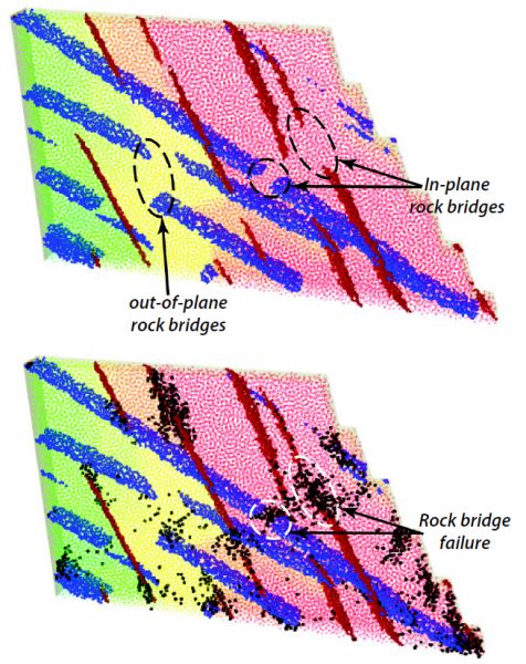 Non-steady fluid flow and pressure within the network of joint segments are modeled, and several aspects of fluid-rock interaction are represented, such as effective stress (for sliding behavior) and pressure response due to changes in rock geometry (e.g., bench removal). This three-dimensional modeling software is based on a lattice scheme that handles discontinuities and new fractures in the same way as Distinct Element Method (DEM), but is five to ten times faster. Fluid flows in the joints and rock matrix, and the flow network is automatically extended as new fractures form.