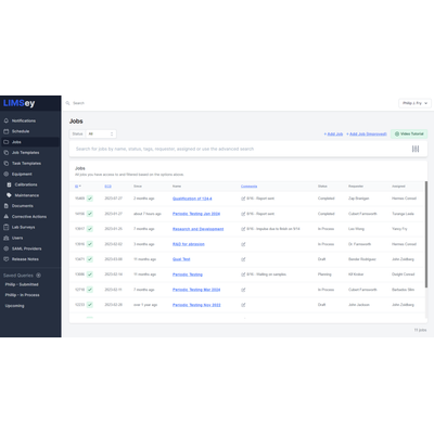 LIMSey offers a sophisticated Laboratory Information Management System designed to streamline operations within engineering, mechanical, manufacturing, and various physical testing laboratories. This robust system facilitates the management of laboratory processes by enabling users to efficiently track and manage jobs, samples, tests, and results. The system includes functionalities for sorting and filtering jobs based on attributes like current status or requester, which simplifies task management. It captures detailed sample information for reporting and historical data analysis. LIMSey's system also addresses the critical need for tracking ancillary tasks that accompany testing processes, such as sample reception, equipment setup, and task reviews. This comprehensive tracking capability ensures that laboratories have a clear and complete understanding of ongoing projects, thereby enhancing productivity and testing throughput.