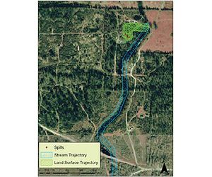 Spilled hazardous liquids frequently travel only short distances overland before they enter a stream or a lake. The OILMAPLAND model system determines the path and physical fate of the spilled oil or chemical once it enters the surface water system. Processes modeled include: