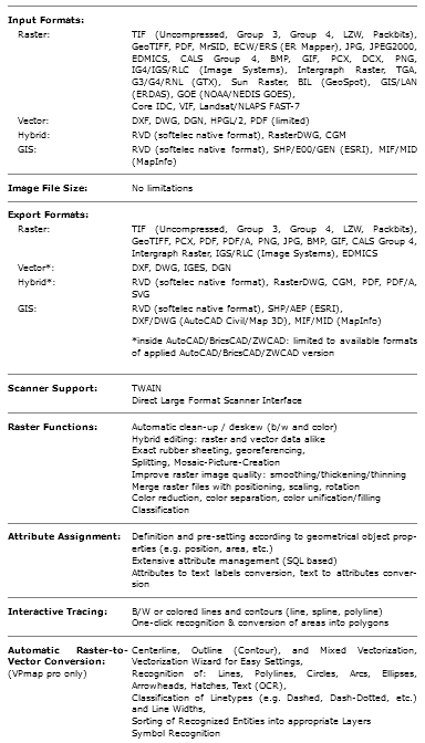 VPmap and VPmap pro provide professional interactive tools to create and edit spatial data and attribute information from scanned maps for transfer into GIS. Simply convert raster maps into vector-based maps, utilize intelligent attribute-definition functions, and add individual attributes. The VPmap Series is targeted at GIS applications, mainly to transfer scanned maps into ArcGIS (ESRI), MapInfo, AutoCAD Civil/Map 3D etc. Thus, VPmap and VPmap pro contain GeoTIFF, Shapefile SHP, and MIF support for import and export explicitly to and from any common GIS platform.