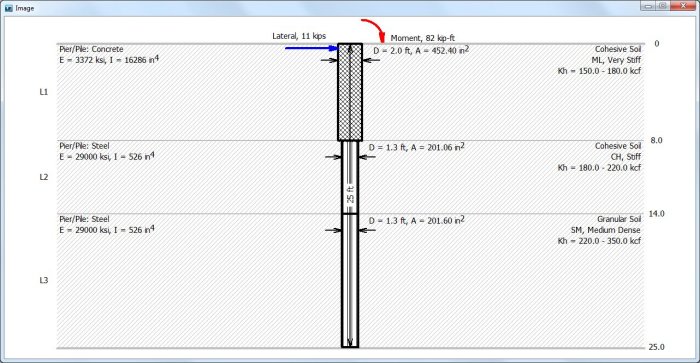 (2) Ability to change the cross section on each soil layer. So you can have tapered or step-tapered piles or piers. You can also analyze performance of new material and new composite piles.