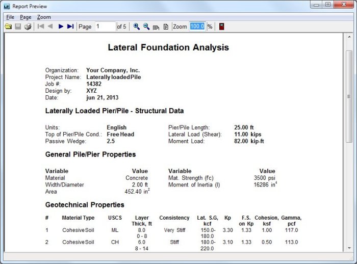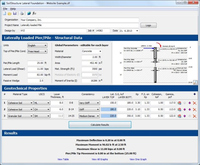 SoilStructure LATERAL FOUNDATION, version 2 analyses laterally loaded piles. Spreadsheets are hard to preserve and it is time consuming to do all the stability and design checks using in house tools. This Lateral Foundation software calculates the capacity of a single driven pile or a single drilled pier/auger cast pile subjected to: Lateral (Shear) load and, bending moment, free head or fixed head.