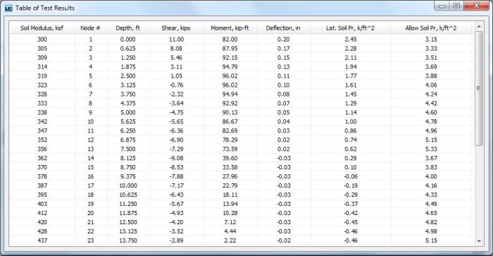 Lateral Foundation software will be a geotechnical engineer’s ally, since structural loadings can be input along with soil layers. Deflection, depth of embedment and induced shear/moment loads are displayed in both tabular and in chart format. The lateral subgrade values can be adjusted to a +/- 30% to account for saturated conditions and/or cyclic conditions.