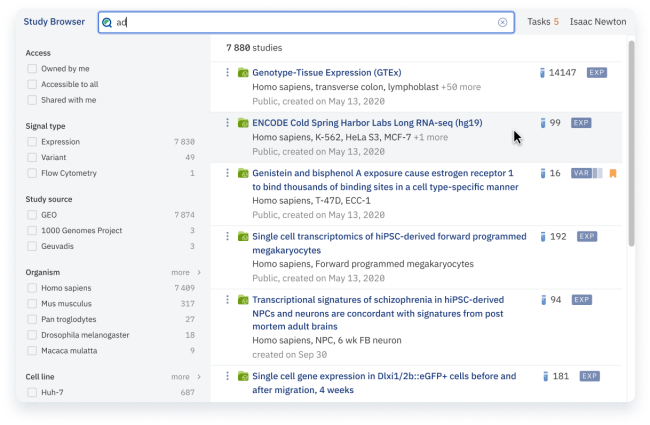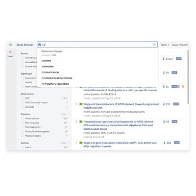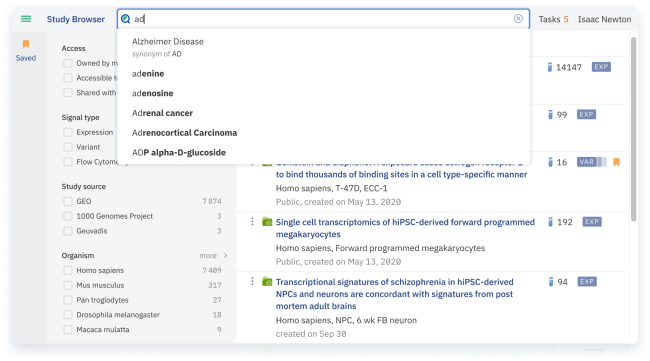 A performant GUI search experience lets you find studies using any metadata via an intuitive search bar with controlled-vocabulary powered auto-completion.