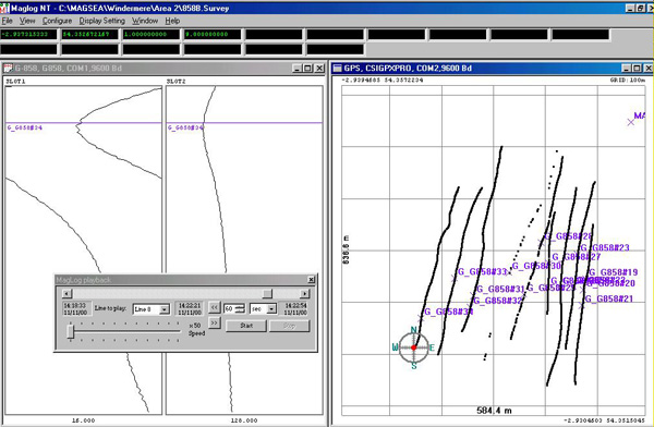 MAGLOG-LITE CAESIUM MAGNETOMETER/GRADIOMETER LOGGING AND DISPLAY SOFTWARE. Package includes the ability to control and receive data concurrently from up to two G-880/881/882 Caesium Marine Magnetometer systems using CM-201/221 Counter assemblies. The system provides graphical display of total field and gradient from multiple magnetometers, altitude above seafloor, sensor depth or other analogue data input to the A/D`s on the CM-201 Counters. Diagnostic measurements for quality control are provided and include signal strength, noise (8th difference), anomaly amplitude for each sensor, plus GPS position with real time track plot display and preset alarm range.
