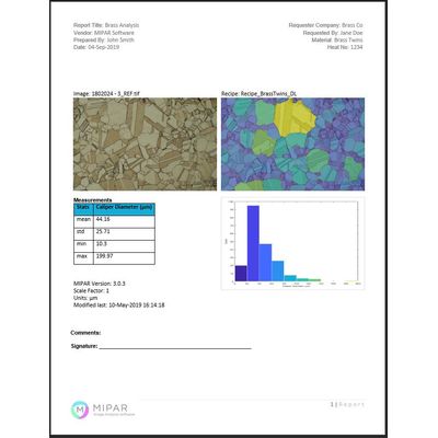 Copper alloy grain size measurement following ASTM E-112 standard. Fully automated grain size solution, analyze micrographs off of the microscope or run sample data sets in batch. MIPAR generates a grain size distribution as well as data statistics. Fully integrated reports are generated for easy data sharing