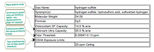 Each odor or air pollutant is treated with one or more types of chemical filters. The performance of the chemical agent and the characteristics of the pollutant are presented to the MediaPik program, so that the optimal combination of chemical filters is made and the most affordable solution is arrived at. The data for hydrogen sulfide is given in the following table: