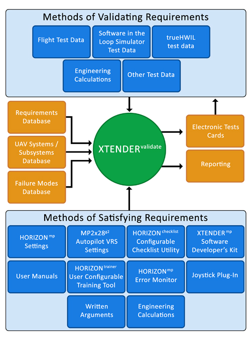 Build quality systems that meet high-level expectations. Develop high-level requirements and easily decompose them into appropriate lower level requirements with XTENDERvalidate, the world’s first available design life-cycle tool for UAVs. Systematically link flight, user, and simulator testing validation data to requirements. Likewise, link requirements to autopilot options and GCS settings. Additionally, XTENDERvalidate incorporates a failure analysis tool that helps identify subsystem failure modes and links them to requirements.