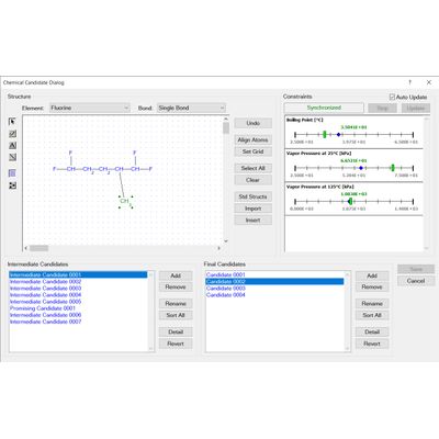 Synapse’s graphical chemical design capabilities gives you complete control over the search for new chemical products. To design new chemicals you to simply draw candidate molecular structures. Synapse then estimates required physical properties, evaluates design constraints and presents the results graphically. Using Synapse’s graphical design you can investigate the effect of changing your current product’s structure or composition, identify conflicting design constraints and discover relationships between molecular structure and physical properties.