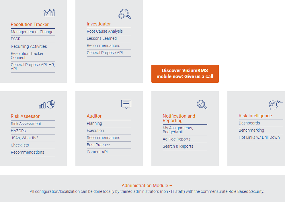 This is where VisiumKMS focusses: The pre-start-up safety review (PSSR), being the first report of incidents and audits. The four critical mobile applications – Resolution Tracker, Investigator, Auditor, and Risk Assessor – are now available at your fingertips, whenever and wherever you need them and even when there’s no Wi-Fi connection.