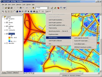 With LimAarc , LimA is embedded in the GIS so you can perform your noise calculations with LimA directly from ArcGIS. Your geo-data (Geodatabase, Shape, ...) are directly available for calculations. There is no need to export the data for calculation purposes, and only one non-redundant set of data remains for further processing. Powerful ArcGIS tools for completing, editing, correcting, and adjusting data are available. You may determine the parameters and start the calculations directly within the GIS. Results are accessible as sets of data and can be used by ArcGIS immediately: e. g. for generation of maps or further processing like merging with other geo-data.