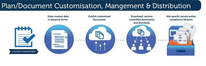 A Simple five step process to keep multi-site documents up to date and site specific. Head office creates a document with merge fields. Administrator allocates documents to plans and sites. Each manager completes a merge field form for all documents allocated. Automatically creates site specific, merged PDF documents and plans. provides auditable plans with document control visible from anywhere you have internet access.