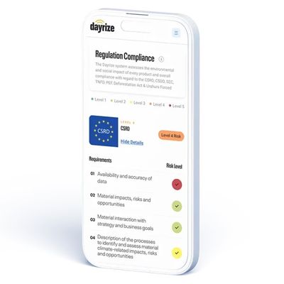 Track progress to comply with regulatory standards. Mitigate risk, maintain ethical operations, and demonstrate commitment to meeting legal and industry obligations. With the help of product-level impact data, Dayrize gets you ready for upcoming and existing sustainability compliance reporting.