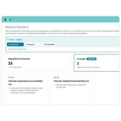 Novata’s free Regulatory Navigator helps you make sense of regulations and highlights your company’s regulatory exposure.