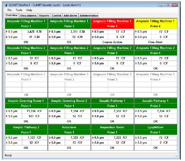 DataPro 3 Software reports on sample data collected from up to twenty Climet CI-3100 Ethernet remote sensors, and also utilizes the CI-309A alarm towers. It provides an intuitive graphical user interface for sample data viewing, data management, scheduling, remote control, graphing and trend analysis, alarms, reporting, and auditing.