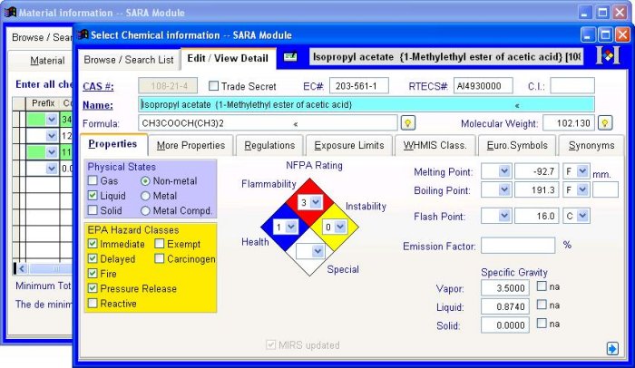 All MIRS™ major modules include the Regulated Chemical database,a complete EPA-regulated database of approximately 1800 chemicals. This database covers all chemicals regulated by SARA Section 302 (Extremely Hazardous Substances list), Section 304 (Comprehensive Environmental Response, Compensation and Emergency Liability Act), and Section 313 (Toxic Release Inventory). The Regulated Chemical database saves time, as you simply select the material`s chemical components from the pull down list.