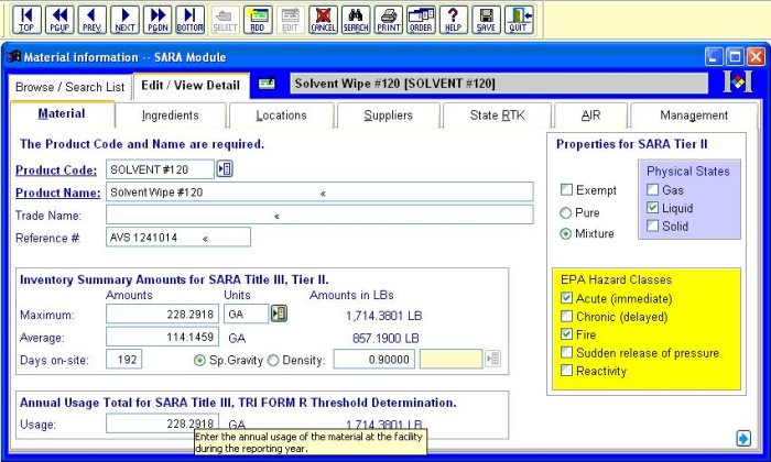 The screen below is from the Material Tracking database. The Material Tracking database contains the information needed for Federal or State Tier II and EPA SARA Title III Section 313 (TRI) reporting. Here you can track information about the materials used in your facility, the storage location and amounts.