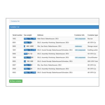 The "SF6 Monitoring Manager" is a database-driven software tool for the intelligent stock management of SF6 gas in switchgear production and for utility companies. All DILO weighing systems and gas refilling devices as well as mass flowmeters with digital interfaces can be connected to the database. The user-friendly software makes it possible to monitor and log the SF6 stock – even across different locations and countries. All incoming and outgoing SF6 vessels can be recorded and logged by means of the software. The history of vessels is thus traceable via an automatically assigned ID number. Vessels can also be freely defined, e.g. cylinders, containers, stationary tanks or GIS components. The supervisor can make changes and manual entries.