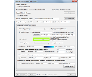Having imported data and made any corrections using the viewer, SonarTRX can generate geo-referenced images for viewing with Google Earth or import to Geographic Information Systems (GIS). The SonarTRX Mosaic creation dialog includes many options to customize the output: