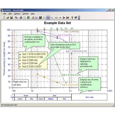 Provides highly customizable, professional quality sieve and hydrometer plots for soils analysis. SieveGraph allows you to produce professional quality, highly customized graphs of sieve and hydrometer analyses.