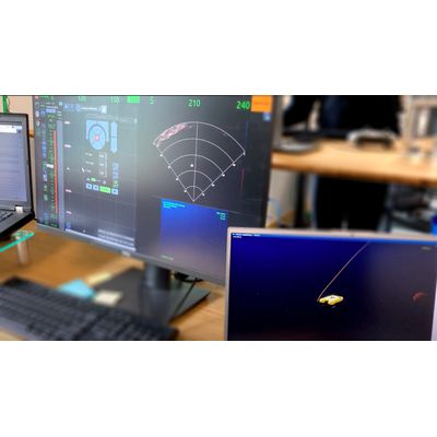 Simulator for EOD Workspace Prepares Operators in a Virtual Underwater Environment; EOD Workspace was developed for small, inspection class ROVs such as the VideoRay® MSS Defender® to specifically address the requirements for use in the EOD workflow. EOD Workspace automates piloting the ROV, so that EOD technicians can focus on the job: locating, identifying and disabling underwater ordnance. Dual screen set-up of simulator. Operator (left) experiences EOD Workspace, exactly as they would flying an ROV. Supervisor (right) as multiple viewing option to oversee operators progress.