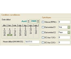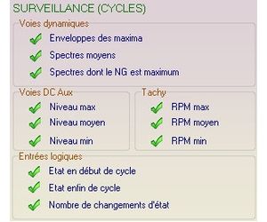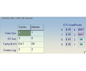 four settings channels, eight logic I/Os and one tachometric input. The interface can be used to easily configure acquisition (e.g., frequency range, duration, type of sensor, etc.) and all the data used to take measurements. Users simply have to indicate the nature of the data to be memorised (spectrum, scalar or status indicators, temporal signals), the indicators to be monitored, the associated alarms (instantaneous or mean levels, overall levels, spectral templates) and the monitoring conditions (e.g., start date, speed range, temperature level, valve open or closed, etc.).