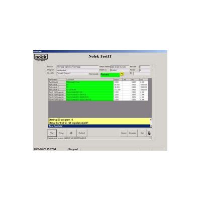 Nolek’s TestIT is an own developed software program for machine sequence control via profibus system. The program is built in Visual Basic 6 and an Access database. All measurements results a stored in a database. Programming is done in a script editor system to make it user friendly and easy to customize. This gives a very flexible machine control tool directly from the PC. An electrical cabinet includes necessary safety components, power supply, profibus modules (I/O and analogue modules). A standard computer (PC) is usually used and is built in a cabinet. The PC-screen is used as an operator panel and gives a clear interface with the operator.