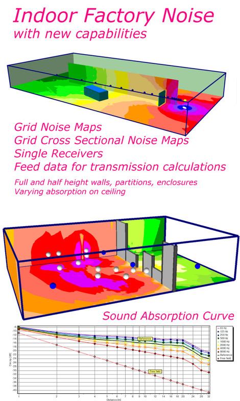 - Noise simulation indoors for determining locations where workers need hearing protection. The acoustical quality is not the issue here, only the position of the 85 dB contour counts.