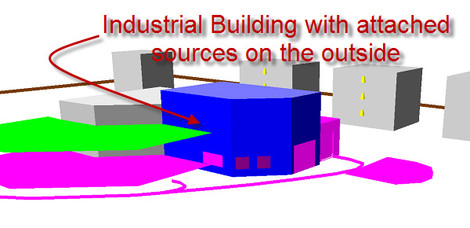 The industrial building is a core element of the industrial noise modeling suite. This object is used for both indoor and outdoor simulations. Freestanding point, line and area sources are the second object type used to define industrial sources. Both types can be used in combination. Regardless if the indoor noise levels are guessed, measured or simulated, the industrial building is the entry point for the outdoor simulation. In the picture to the left, the industrial building shows sources superimposed on the sides. These are the windows. They are subjected to the same indoor noise levels, but have a different transmission loss. By embedding the sources on the industrial building, SoundPLAN can work with correct spectral sound power and source size information. This is much more transparent than working with differential sources.