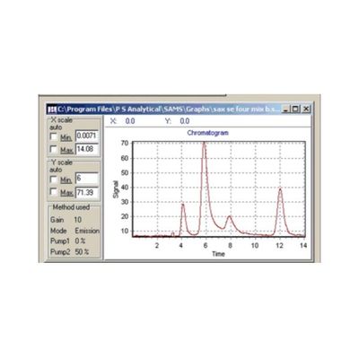 SAMS (Speciation Application for Millennium Systems) - provides the user with the ability to control the various pumps and valves on a PSA 10.025 Millennium Merlin or PSA 10.055 Millennium Excalibur system and to record a chromatogram via the USB/RS232 link on these analysers. The software then allows you to manually measure the peak size or export the chromatogram to Excel. Peak integration can also be accomplished in the SAMSCalc application.