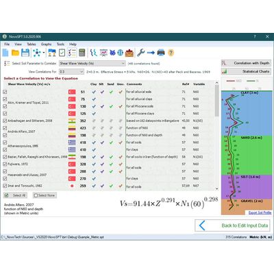 NovoSPT is a powerful, user-friendly geotechnical software for correlating soil properties from SPT blow counts. We have gone through more than 70 published papers and geotechnical reference books and collected over 325 SPT correlations with various soil properties.