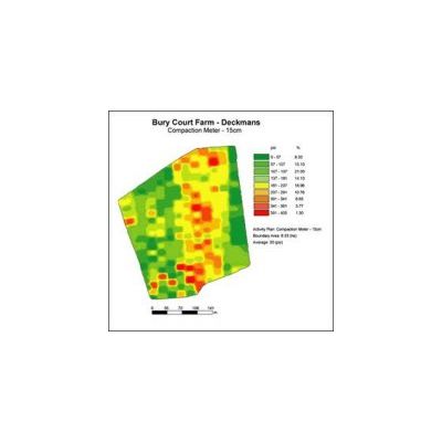 subSOYL helps identify and target compacted areas for efficient subsoiling. The compaction meter is an automated hydraulic penetrometer designed to be mounted onto a quad bike. GPS software records a field boundary and a grid is then overlain to produce a sampling template. The bike is driven to each sampling point and the hydraulic compaction meter activated. As the penetrometer moves down through the soil profile, pressure on the point of the penetrometer is recorded every 2 centimetres. The pressure is measured in psi and is recorded on the compaction meter software. Site specific information can then be mapped and used to show where compaction occurs across the field and at what depth. Compaction map at 15cm depth, indicating high levels of compaction (red) through to lower compaction levels (green).