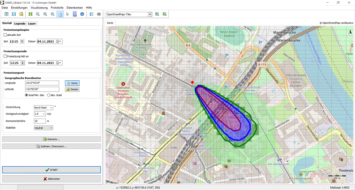 [1] Topography and land use data are not included for applications outside of Germany and can be supplemented by us optionally. Without topography and land use data a flat terrain with a homogeneous land cover is assumed for the dispersion calculation.