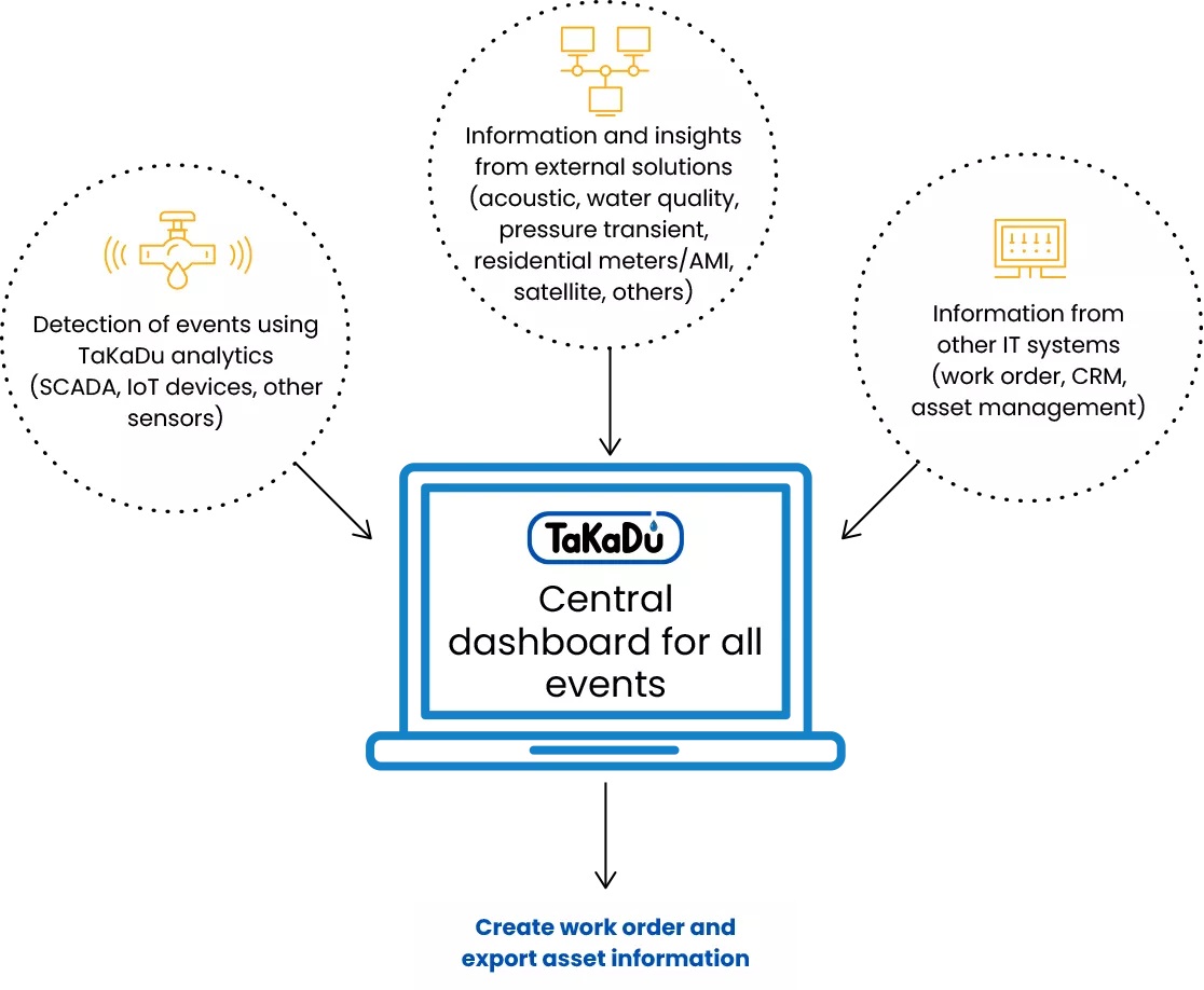 TaKaDu enables you to advance to smart water management by integrating data, information and insights from your various detection devices and systems, external solutions and other IT systems into one comprehensive dashboard.