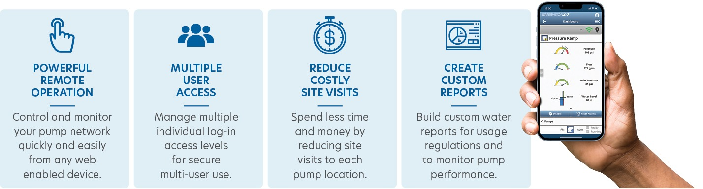 Monitor and control from anywhere: Cloud-based dashboards keep key information at your fingertips. View and control all pump equipment in multiple locations. Whether in front of the station or from a remote location, WaterVision 2.0 provides equal control of system adjustments including set points, safeties, and alarm resets. Comprehensive system alerts to inform users and service personal.