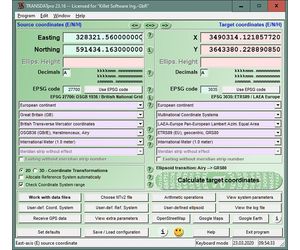 The source coordinates can be entered directly into the input fields of the program window and transformed using the previously selected settings. The calculated results will be displayed. The program will automatically save the entered source coordinates and the calculated target coordinates to a log file. You can review and retrieve log file contents using external programs.
