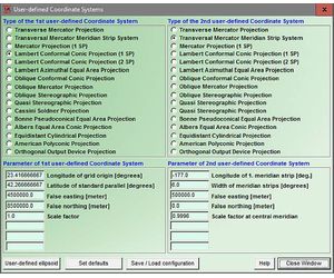Additional to in TRANSDAT predefined Coordinate and Reference Systems listed under the link above, user defined Coordinate Systems can be used by the input of the necessary transformation parameters.