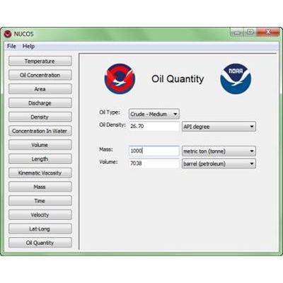 The NOAA Unit Converter for Oil Spills (NUCOS) is a simple desktop tool that converts basic units of velocity, mass, length, etc., but more specifically, converts units that are unique to oil spill response. NUCOS includes some of the lesser known units used in managing oil and chemical spills. For example, it converts the units for oil volume, viscosity, and density from the conversion list of the Dispersant Mission Planner 2, a tool that helps spill responders assess dispersant application system performance.