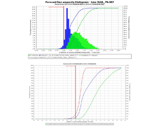 The above graph shows the statistical distribution of ampacity gains (vs seasonal ratings) with (blue curve) and without (red curve) taking into account the effect of wind on Day-ahead (24h) forecasts (green curve is real time). It shows that “temperature only” gains culminate at around 20%, while “wind-included” forecast can reach as much as 70% gains. A median gain of around 20% can be expected when accounting for wind, while it is only 10% with temperature only.