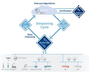 By linking with AI you can derive algorithms for optimal control logic and procedures, and then use a digital twin to verify whether those algorithms function effectively. By feeding back verified algorithms to manufacturing sites through the Collaborative Information Server, the system can continuously optimize itself throughout the plant lifecycle.