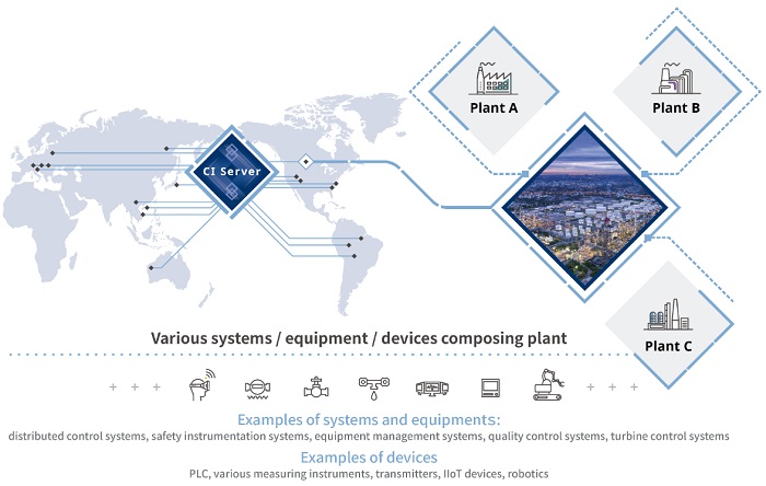 Through blended management of the various data and information from production and operation at individual plants, Collaborative Information Server can achieve system integration, and combine operation monitoring of the many systems (such as DCS and equipment management systems) that make up the plants. As a result, systems, equipment, and devices can be integrated across multiple plants.