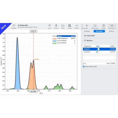 CrystalDiffract lets you simulate multi-phase mixtures simply by dragging-and-dropping patterns into a mixture group. You can adjust mixture compositions in real time, using the mixture slider and text controls in the Parameters List. Additional controls let you lock the mixture total or reset components to zero, for easy manual editing of phase proportions.
