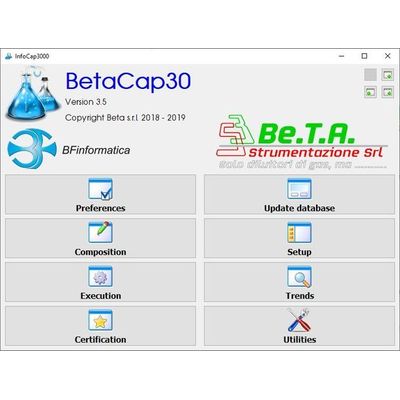 InfoCAP3000 is a PC program (Windows) capable of managing all the BetaCAP series gas dividers functions automatically and unattended. The test is defined through a list of “steps” that correspond to the different commands that the program gives to the diluter via RS485 according to the AK protocol : some commands (eg: activate the dilution factor XX / 30) are explicitly included in the list, while others (eg: detects the value of the pressure or instrument measurements) are implicitly managed by the software. For each position in the list, the command is chosen from those available (drop-down menu) and is often characterized by one or more parameters (eg: time, dilution factor …). No programming knowledge is required.