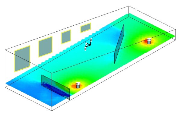 The evaluation of the performance of various possible treatments is simple: Apply the acoustic treatments being considered for the room using the Absorbing Panel or Acoustic Barrier tools, and then click on the Calculate Noise Map button. The room’s new noise map displays the noise levels obtained with the added treatments. A similar process can be applied to the room’s noise sources (ex., adding a silencer).
