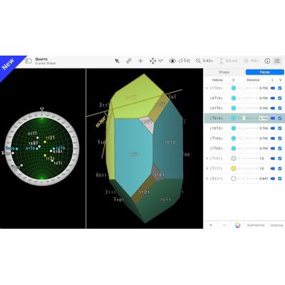 SingleCrystal lets you build crystal shapes quickly and easily. Just enter one or more faces and let SingleCrystal calculate their symmetry-relations. Click-and-drag slider controls to set the face positions ("Wulff Construction") then you can measure interfacial angles or vertex relationships.